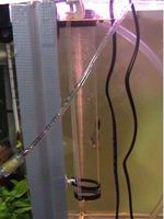 utilice la vieja campana del equipo de sirocco una bombita de agua de las mas pequeñas un estrangulador 2 metros de tubo 4mm de aireador 1 aguja hipodermica 30 cms tubo de 12mm 1 valvula anti-retorno Construccion: 1º coji la campana y le acople el tubo que venia de la bomba que va situada debajo del reactor 2ºen el otro agujero que lleva la campana por la parte superior le puse un trozo de macarron de 4mm y un estrangulador para que no se escapara nada de c02 y poder inyectar el c02 con la aguja hipodermica 3ºen la parte de abajo de la campana hay que poner un trozo de unos 6 cms de ancho, de esponja de las que usamos en los filtros, con el fin de que las pequeñas burbujas de c02 , no se escapen facilmente y asi ayuda a su disolucion en el agua. Funcionamiento: El c02 entra a la campana en la parte superior por la aguja hipodermica y se encuentra directamente el chorro a presion que mete la bombita , con lo que las burbujas de c02 se rompen en muchas burbujillas pequeñitas y van dando vueltas por la campana , hasta su comploeta dislucion. este reactor lo use hasta que me hice uno exterior , que luego explicare. |